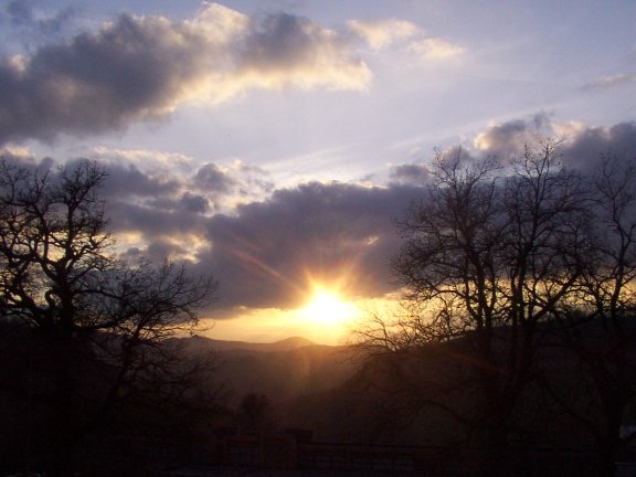 Tutt'intorno si colora d'oro, grazie ad un bellissimo tramonto che fa capolino tra le colline, le nuvole e gli alberi ancora spogli. |