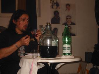 Simone si concede una cenetta stile osteria...con vino rosso, tavolino da bar...e prima fila alla tv. Che osteria sarebbe senza un degno cameriere? Andrew-beyond si presta nella mansione, mescendo vino a Mr.Tristezza...BEYOND!